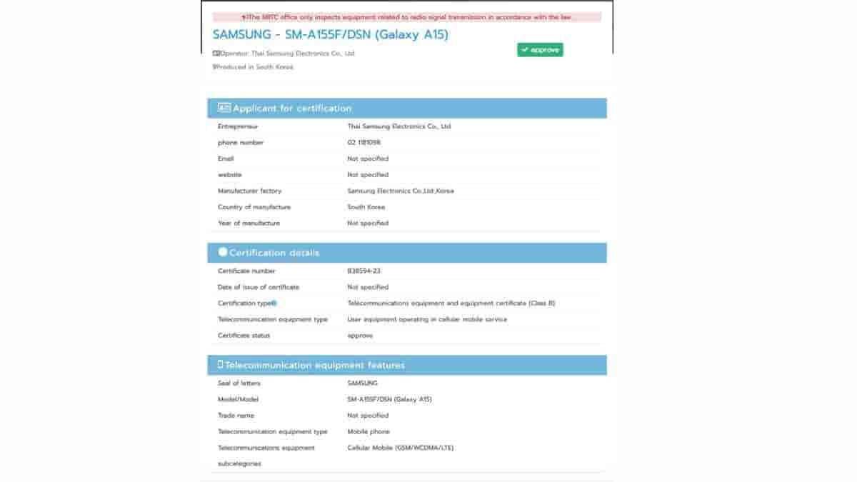 Samsung Galaxy A15 4G spotted on NBTC certification website; launch seems imminent