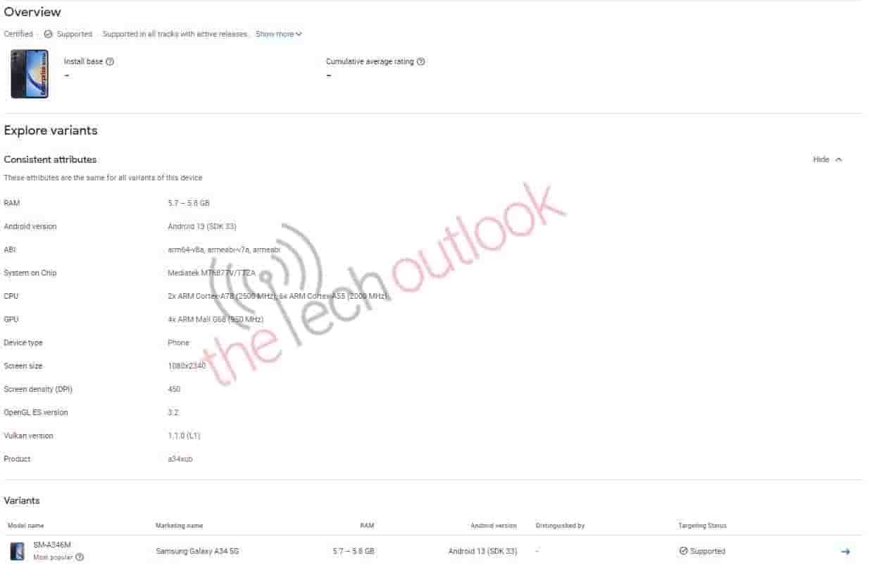 Specifications (as per Google Play Console listing) Samsung Galaxy A34 5G