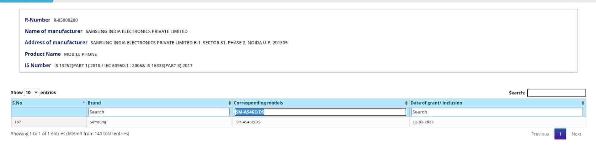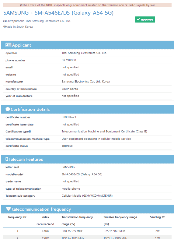 Samsung Galaxy A54 5G receives the NBTC certification and the Indian BIS certification with another model number