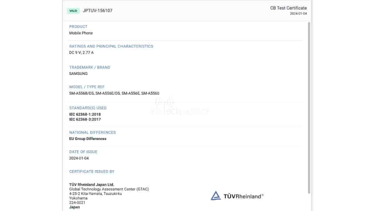 Today our team at The Tech Outlook spotted Galaxy A55 on the TUV Rheinland website with model numbers SM-A556B/DS, SM-A556E/DS, SM-A556E, and SM-A5560.