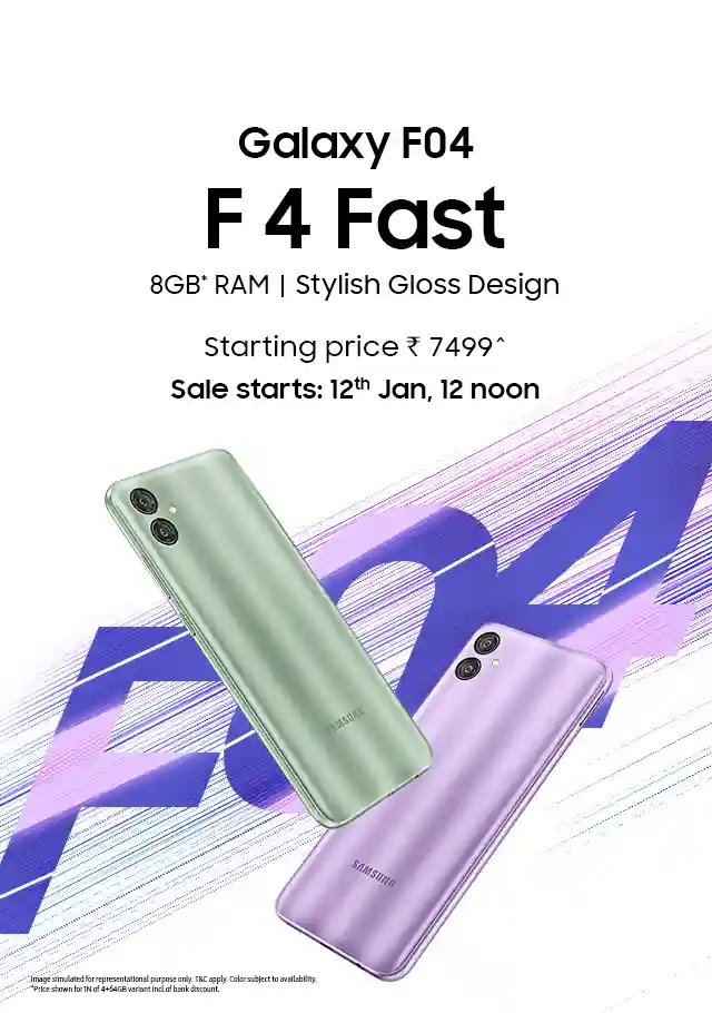 The Samsung Galaxy F04(8GB) F 4 Fast is available at a starting price of ₹7,499 after availing of the discounts. The sale starts on 12th Jan at 12:00 noon in the Samsung store.