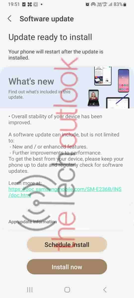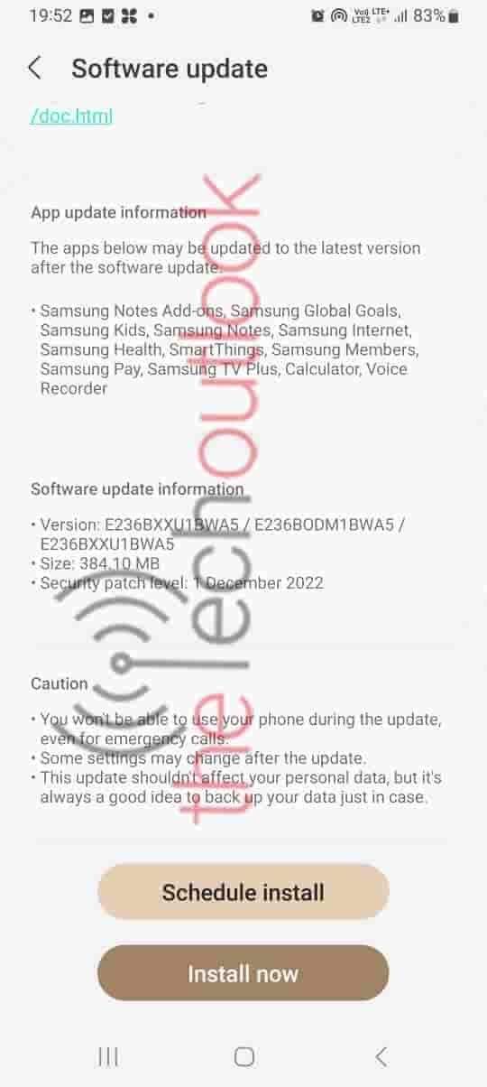 You can do this in two simple steps. The first step is to update the latest software available on your Samsung Galaxy F23 5G phone. Visit the ‘Settings’ of your phone. Go to ‘About Device’. Then select ‘Software Update’. The size of this update is 384.10 MB. You will receive December 2022 security patch updates once you install the update. You can view two options here. Either you can ‘Schedule Install’ or ‘Install Now’.