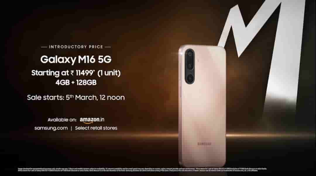 Galaxy M16 5G arrives at a starting price of Rs 11,499 (4GB/128GB). It includes a Rs 1000 bank discount on selected banks. The device is available in Blush Pink, Mint Green, and Thunder Black colors. The sale for this device will start on 5 March at 12PM via Amazon, Samsung.com, and selected retail stores.