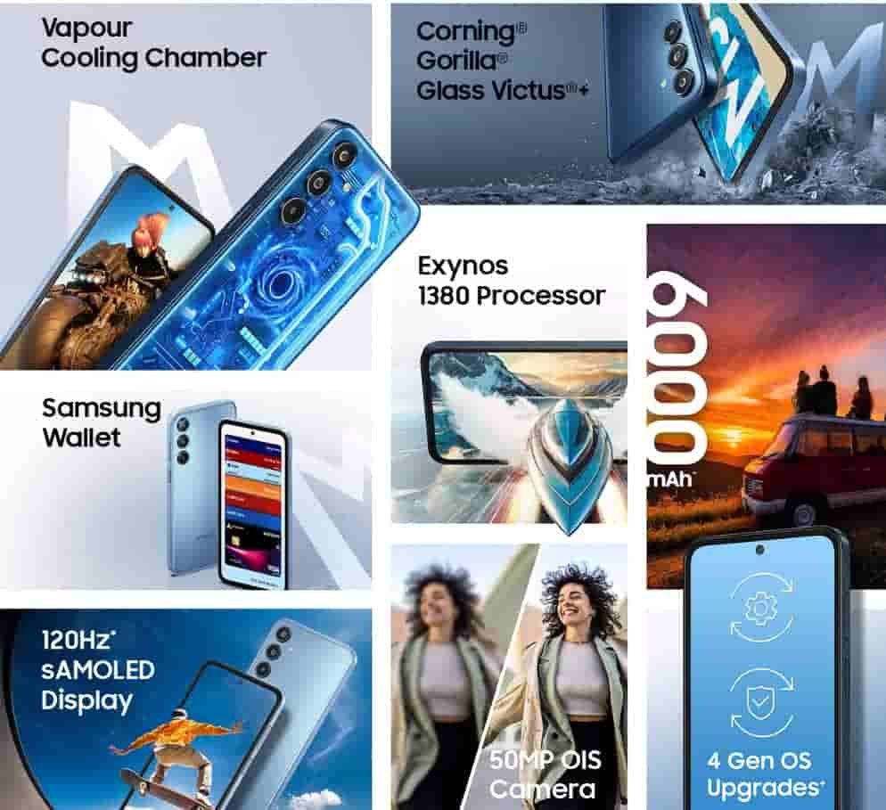 It is powered by an Exynos 1380 processor paired with up to 8GB RAM and up to 256GB storage. In the camera department, the smartphone comes with a 50-megapixel main camera with OIS support, an 8-megapixel ultra-wide lens, and a 2-megapixel macro camera. The front side of the smartphone sports a 13MP selfie camera. It runs One UI 6.1-based Android 14.