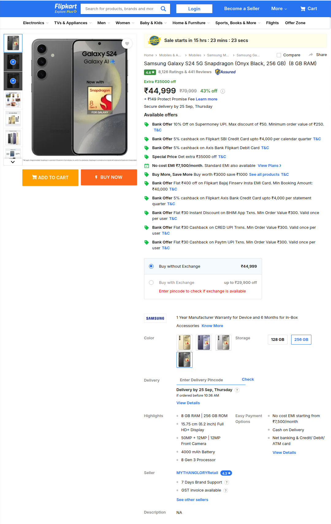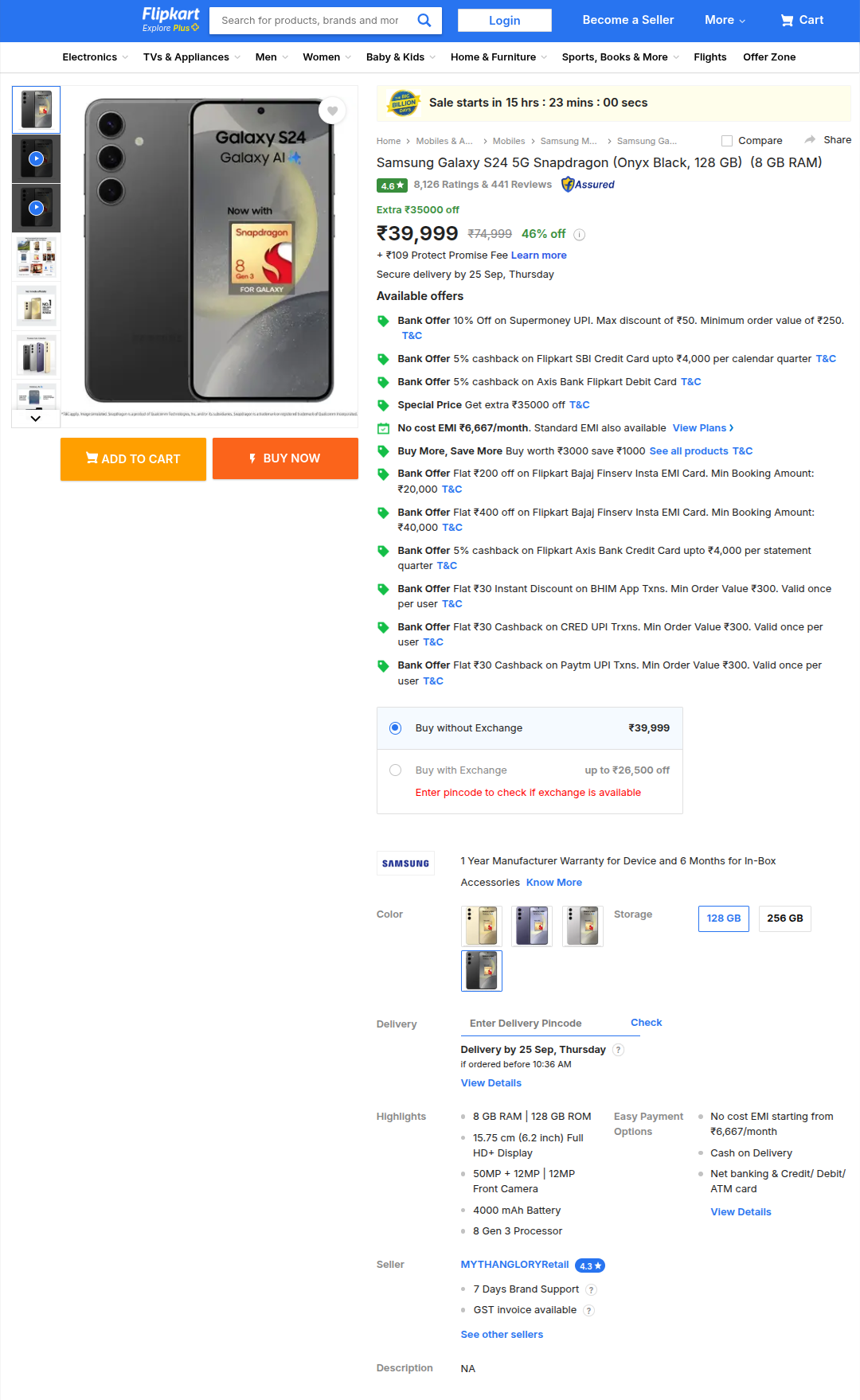 Samsung’s Galaxy S24 Snapdragon Edition (powered by the Snapdragon 8 Gen 3 chip) has been unveiled for Indian customers in two storage options (8GB/128GB, 8GB/256GB) and four color choices (Amber Yellow, Cobalt Violet, Marble Gray, Onyx Black), and it is now available for INR 39,999 starting price (from its actual list price of INR 74,999; 8GB/256GB now costs only INR 44,999 from INR 79,999). Do note, INR 109/INR 149 protect promise fee will also be added, while customers can use up to 50 Flipkart Super Coins. With offers, the effective price can be reduced to up to INR 38,999 and with the EMI options, customers can get it for as low as INR 4,333 per month.