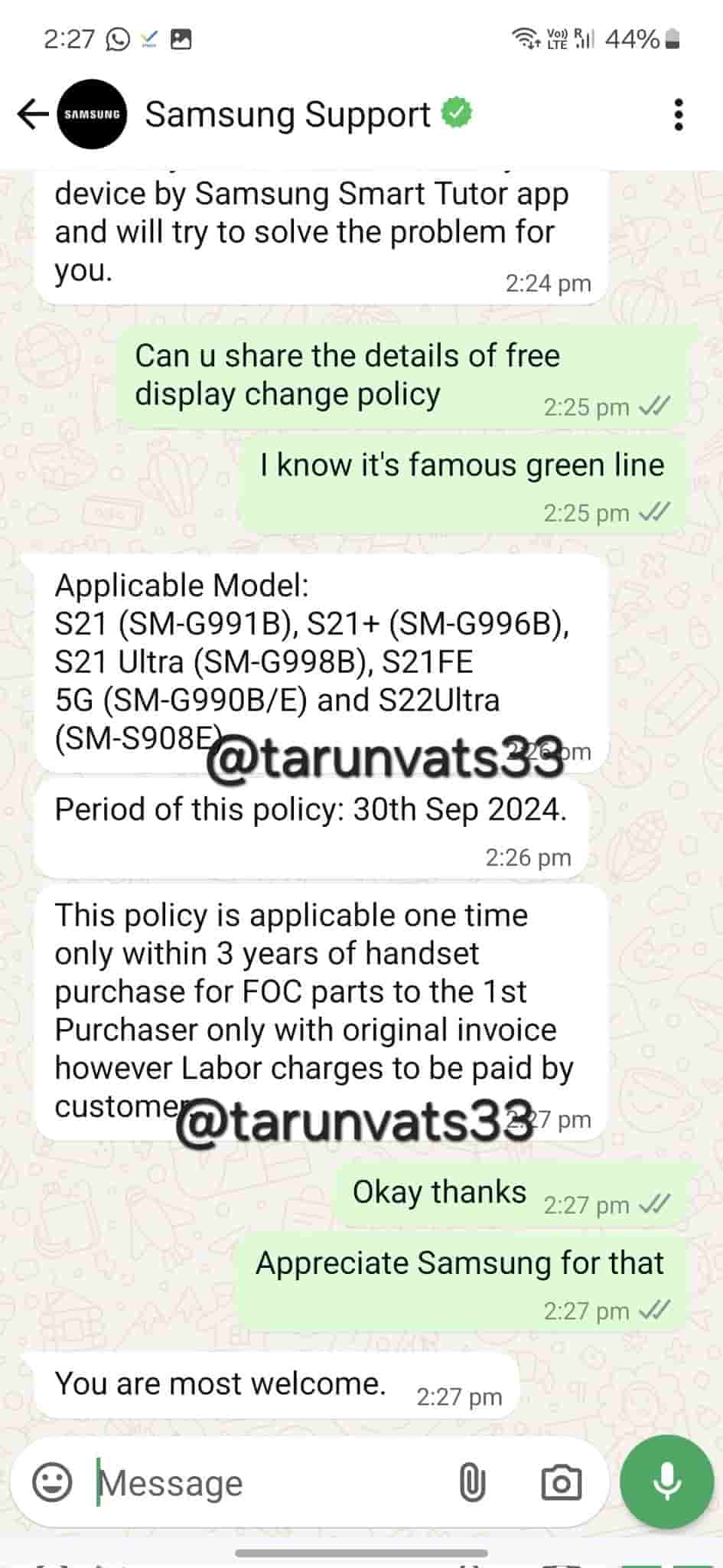 And now few more models have been made applicable for this One-Time Free Screen Replacement offer. As shared by tipster @tarunvats33, Samsung India is offering a One-Time Free Screen Replacement for selected models within 3 years of purchase experiencing the Green Line issue until 30th September,2024.