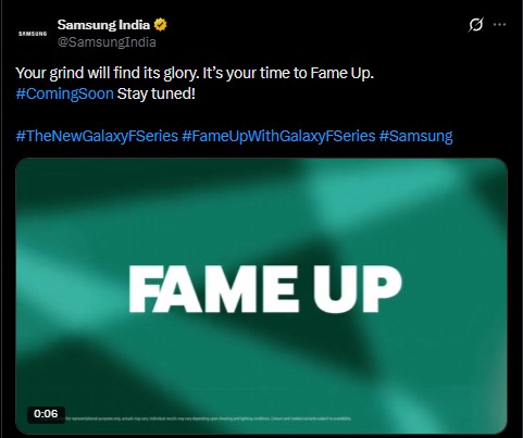 Samsung has officially teased the launch of its upcoming smartphone under its F series in India. In a teaser posted on X via its official X handle, Samsung India wrote, “Your grind will find its glory. It’s your time to Fame Up. #ComingSoon Stay tuned!” Along with this, the company also shared a short teaser video that includes the lines, “all grind, but no glory. Your time to fame up. Galaxy F series, fame up. Coming soon.” While the teaser does not reveal the phone’s moniker, it clearly confirms that a new Galaxy F series model is on the way.