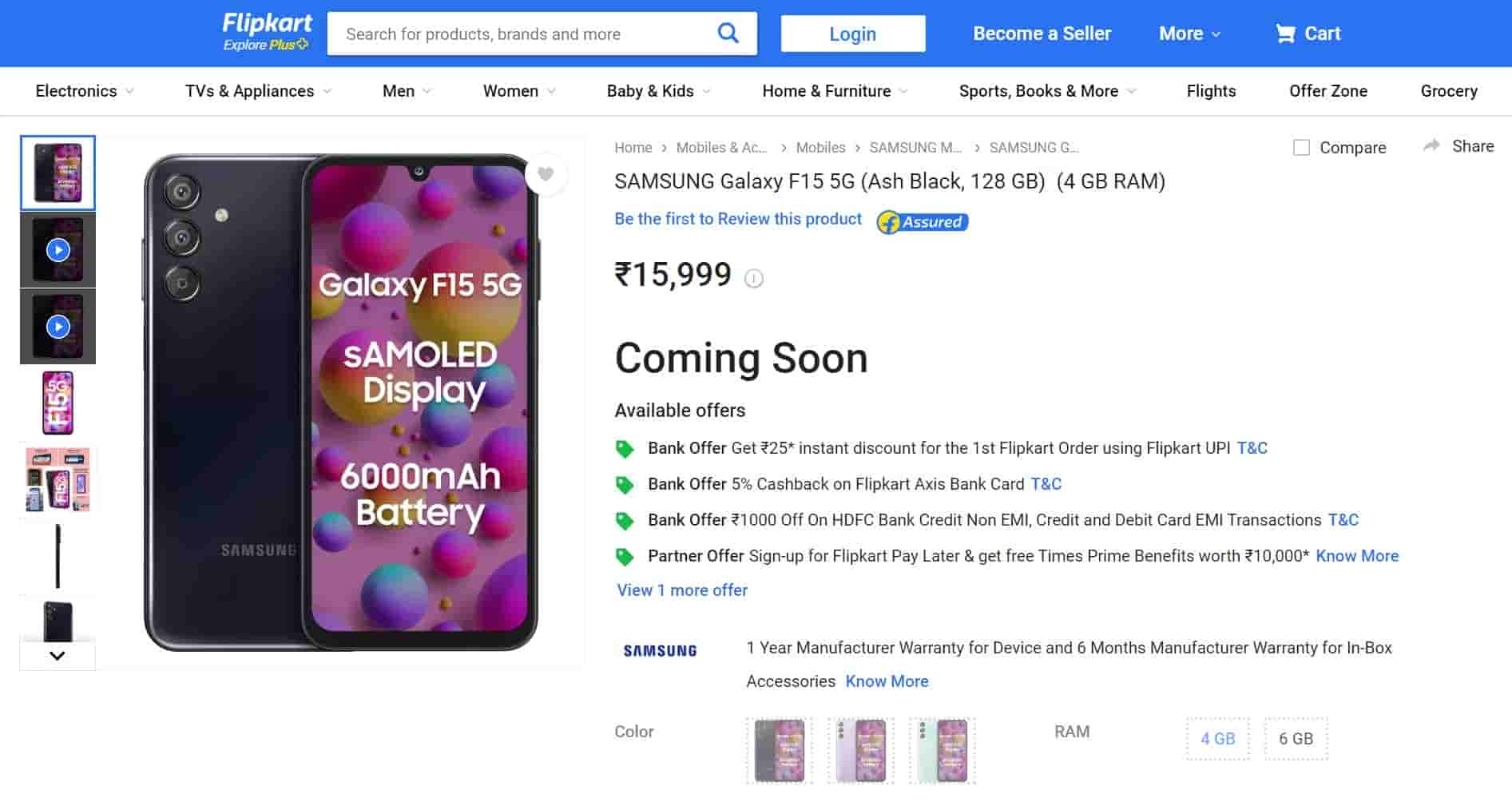 The latest Samsung Galaxy F15 5G smartphone is powered by the MediaTek Dimensity 6100+ chipset and is integrated with the ARM Mali G57 MC2 GPU. It runs on the Android 14 based One UI 6 custom skin, and Indian customers will get to buy it in 4GB/128GB and 6GB/128GB storage options. The device also supports an expandable storage of up to 1TB as well.