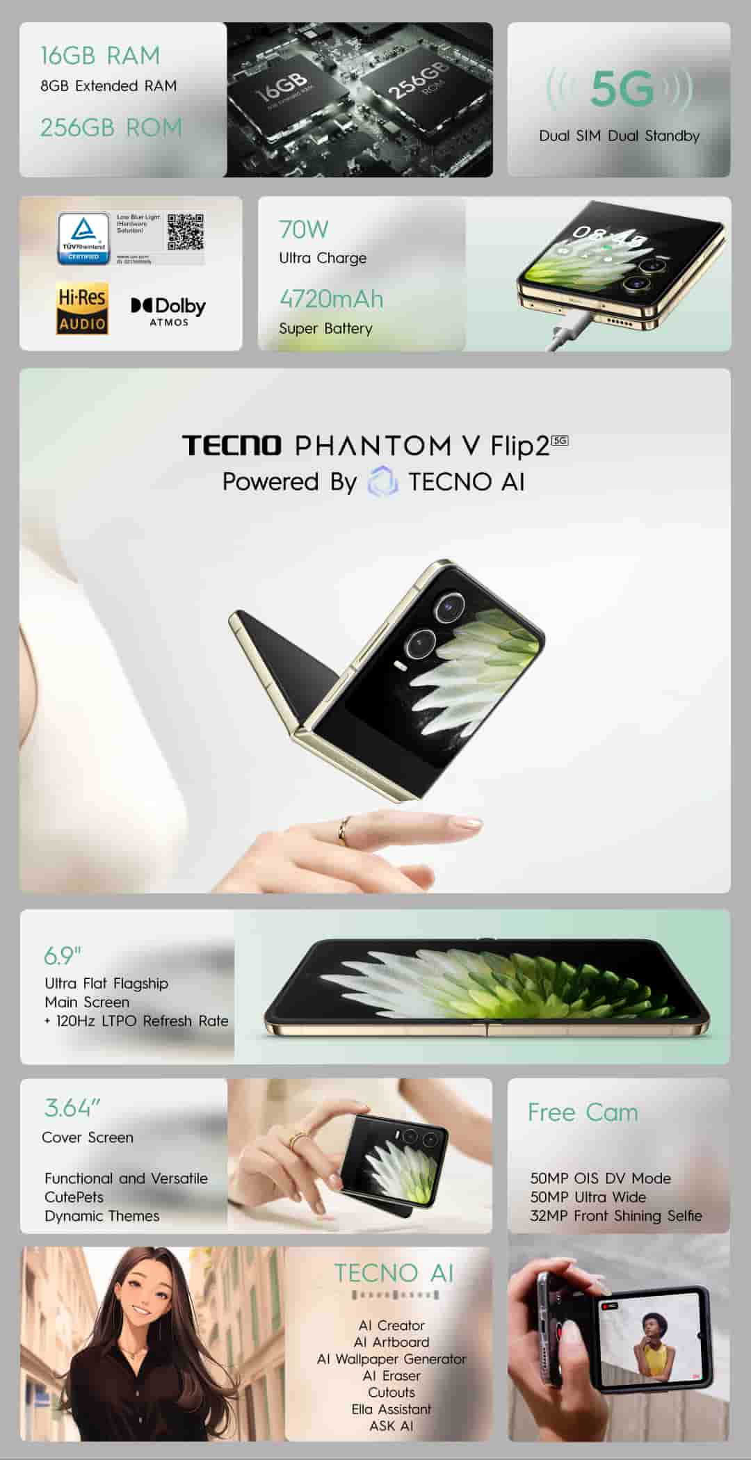 The Tecno Phantom V Flip 2 has a 6.9-inch wide FHD+ AMOLED LTPO main display with up to 120Hz refresh rate. Its cover screen is 3.64 inches wide with an AMOLED display. It is powered by the MediaTek Dimensity 8020 paired with 8GB RAM and 256GB storage. In the camera department, the smartphone has got 50MP primary camera and a 50MP ultra-wide camera. The front side of the smartphone sports a 32MP selfie camera. It is backed by a 4,720mAh battery that supports 70W fast charging. It runs Android 14 out of the box and also comes with a side side-mounted fingerprint sensor, dual speakers, and supports WiFi 6E, and Bluetooth v5.3.