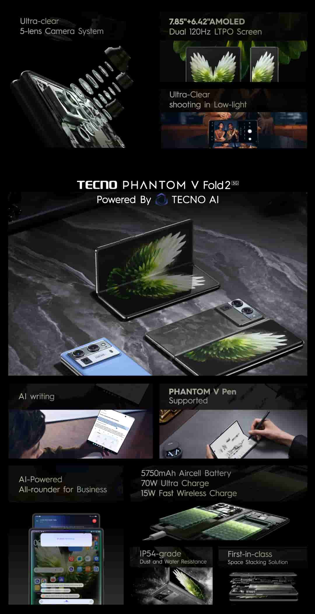 The Tecno Phantom V Fold 2 5G smartphone features a 6.42-inch wide FHD+ AMOLED cover screen and a 7.85-inch wide inner 2K+ AMOLED foldable display. It is powered by the MediaTek Dimensity 9000+ chipset paired with 12GB RAM and 512GB storage. In the camera department, the smartphone has a 50MP primary camera with OIS, a 50MP portrait sensor, and a 50MP ultra-wide camera at the back. For selfies, it has dual 32MP cameras. It is backed by a 5,700mAh battery that supports 70W charging and 15W wireless charging. It runs Android 14 out of the box. It runs Android 14 out of the box and is committed to receiving two OS upgrades and three years of security updates. The smartphone supports Phantom V Pen.