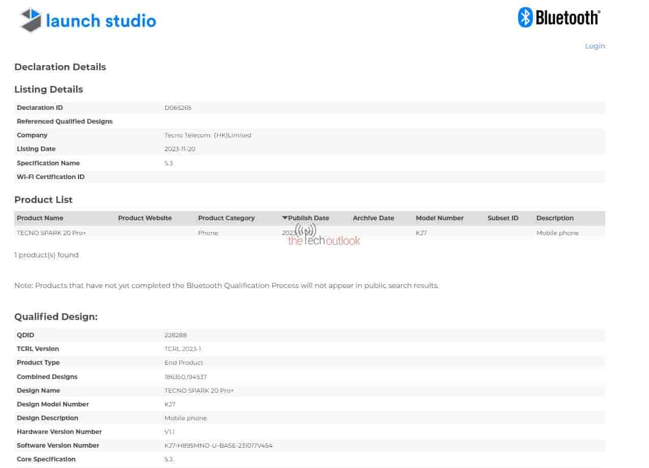 Recently Tecno Spark 20C was spotted on Bluetooth SIG and Geekbench database, Tecno Spark 20 Pro was also spotted on Bluetooth SIG certification website while Tecno Spark 20 was spotted on Google Play console website. The appearances of these upcoming devices hinted towards the launch of the series soon. Ahead of the official launch of this series, our team at The Tech Outlook has spotted the Tecno Spark 20 Pro+ smartphone on the Bluetooth SIG certification website.