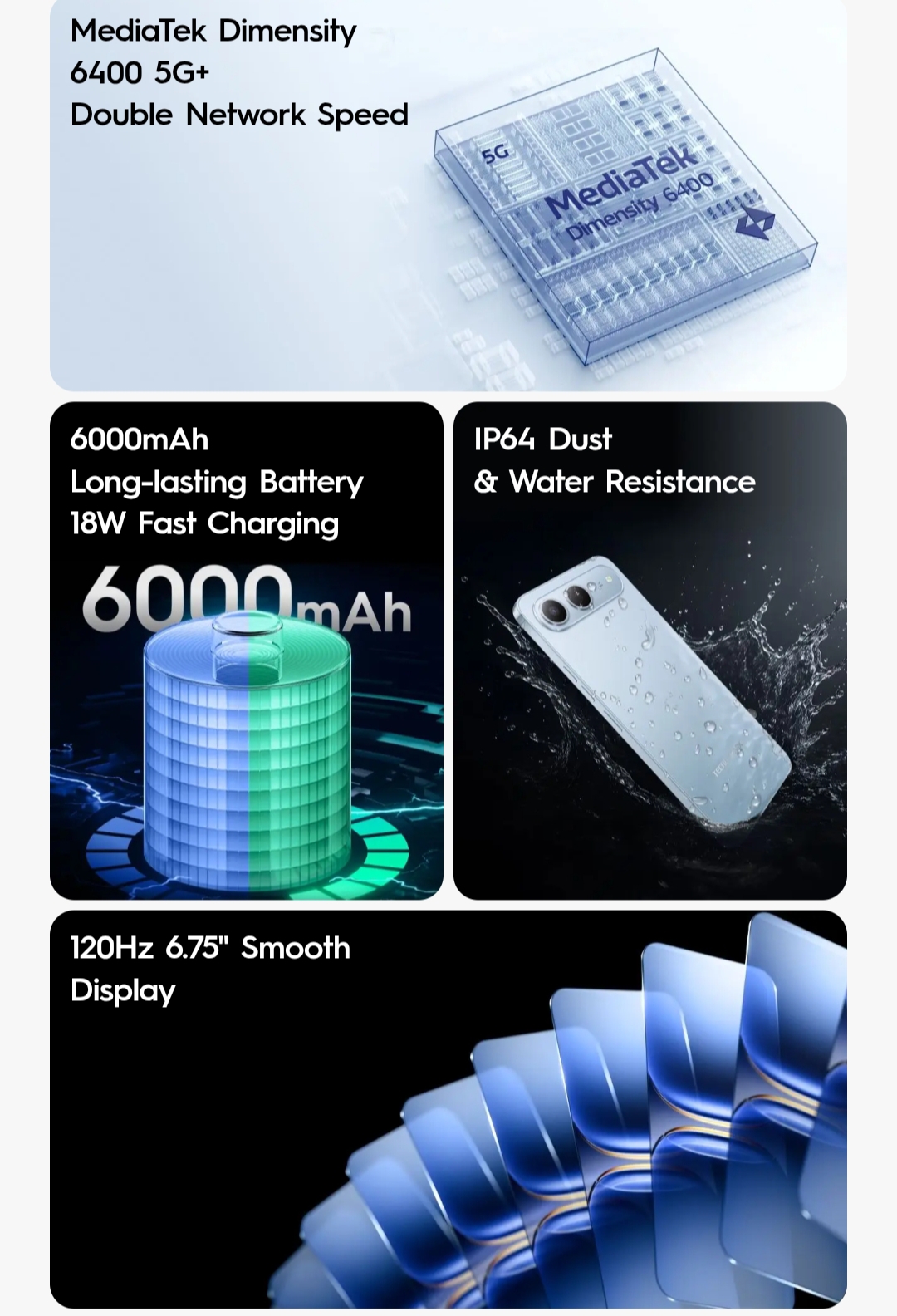 The smartphone sports a 6.75-inch display that offers a 120Hz refresh rate and HD+ screen resolution. It is powered by MediaTek Dimensity 6400 SoC paired with 8GB (4GB+4GB virtual RAM)/16GB RAM (8GB+8GB virtual RAM) and 128GB/256GB internal storage. It runs on Android 15 OS. The device is backed by a 6000 mAh battery and supports 18W fast charging.