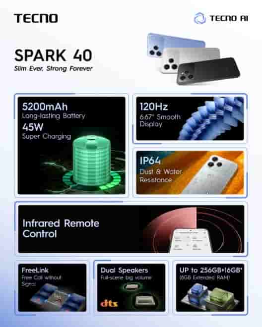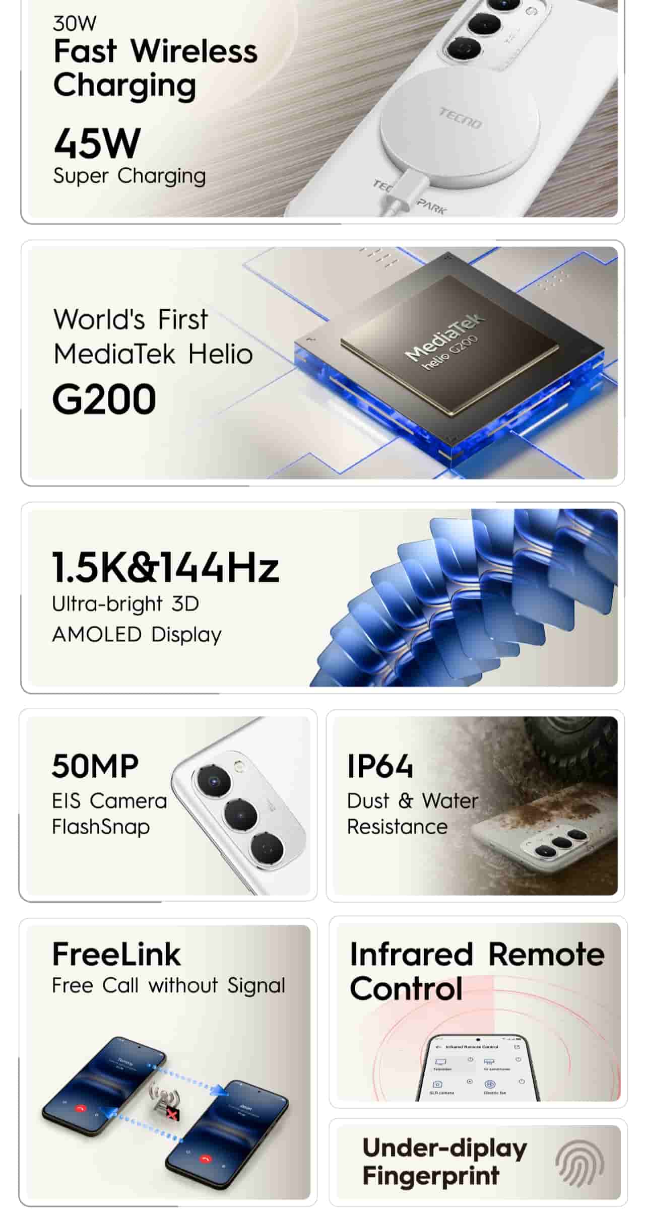 Other features include- IP64 dust & water resistance, Tecno AI (Ask Ella, AI Writing, AI Translate), DECO design, 4 years Lasting Fluency Guarantee, FreeLink, Drop resistance up to 1.5m, Infrared remote control, dual speakers, and Outdoor Booster.