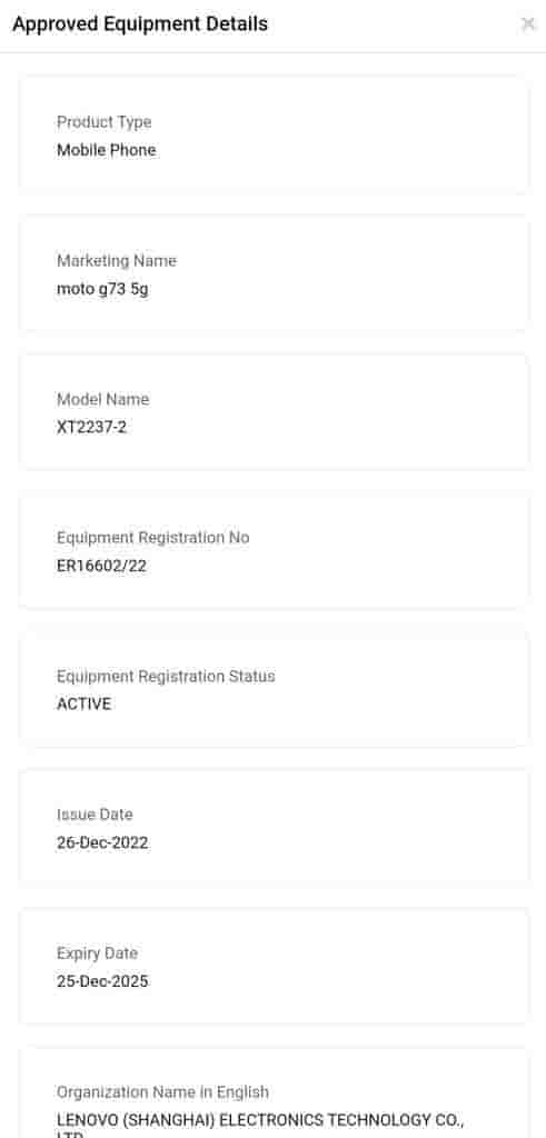 Recently the Motorola G73 5G XT2237-2/XT32345-3 appears on TDRA BIS Indian certification with an active registration status and equipment Registration no. of ER16602/22. Secondly, the Motorola G53 5G XT2335-2 appeared on TDRA certification.