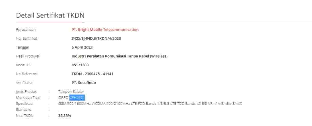 Thanks to this certification, we now have two model numbers: the Oppo CPH2525 and Oppo CPH2521. Both of these models are being certified today with the certification number 3426/SJ-IND.8/TKDN/4/2023 for the Oppo CPH2525 and 3425/SJ-IND.8/TKDN/4/2023 for the Oppo CPH2521. Not much information is available about these smartphones on the TKDN website.