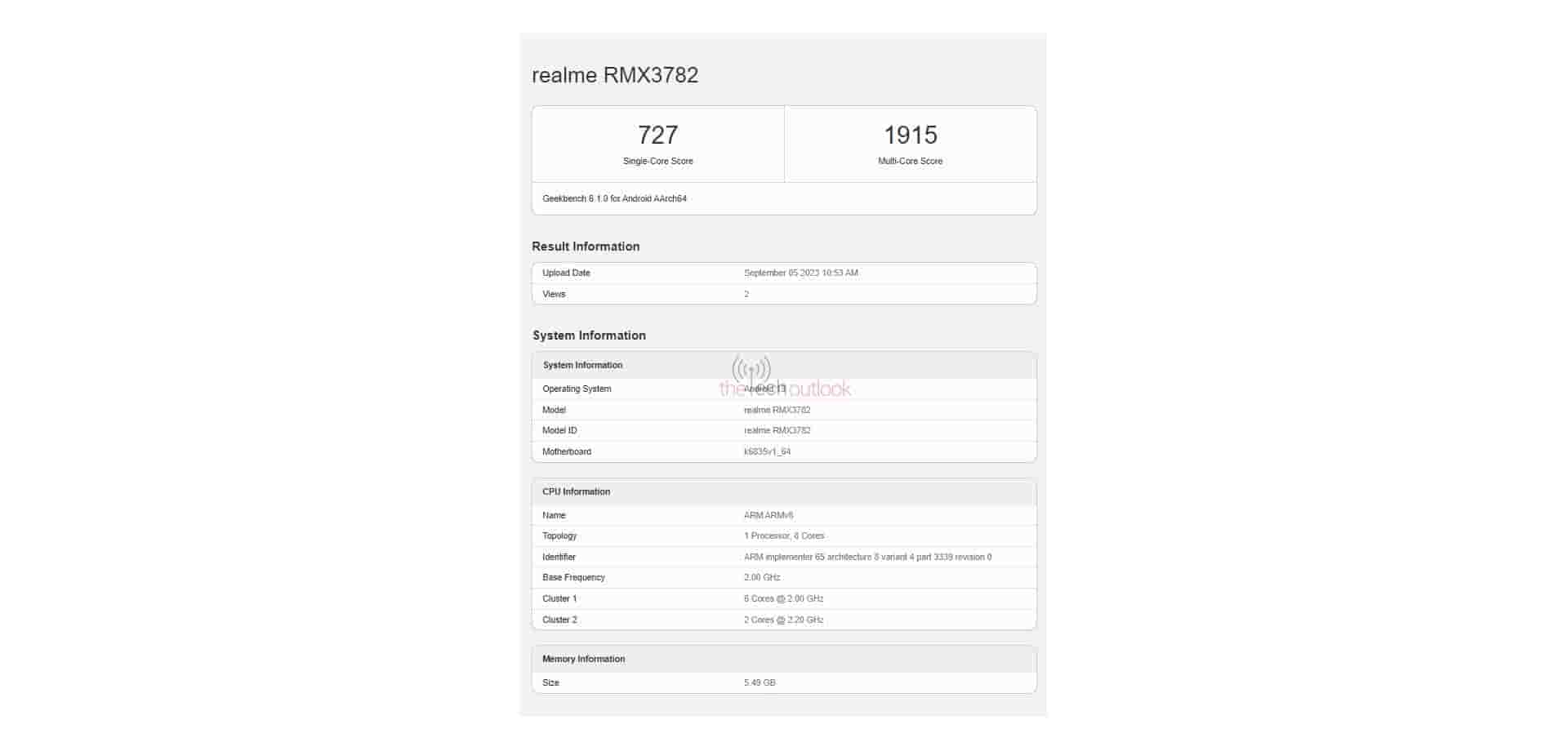 The device has received a 727 single-core score and a 1915 multi-core score. The listing reveals that the smartphone will be powered by MediaTek Dimensity 6100+ chipset and equipped with Mali G57 MC2 GPU. It will arrive with 6GB RAM and run on Realme UI 4.0 based on Android 13 OS.