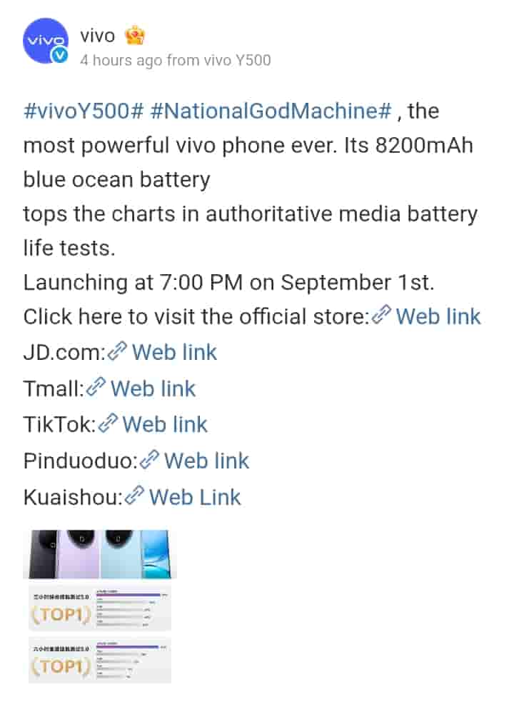 In the new Weibo teaser, Vivo’s Y500 smartphone has been teased with the tagline – ‘National God Machine’ and it is again pointed out to arrive as the most powerful Vivo phone ever with a 8200 mAh Blue Ocean Battery within it. Coming to its revealed battery life test results, the newly-shared teaser poster reveals that in the three-hour light battery life test 5.0, six-hour heavy battery life test 5.0, and in the extreme battery life test to shutdown 5.0, the Vivo Y500 is claimed to have taken the first place in charts. Speaking more, 77% and 40% battery life were retained by the device respectively after the three-hour light battery life and six-hour heavy battery life tests. Also, the device worked for 9 hours and 6 minutes in the extreme battery life test until it shut down.