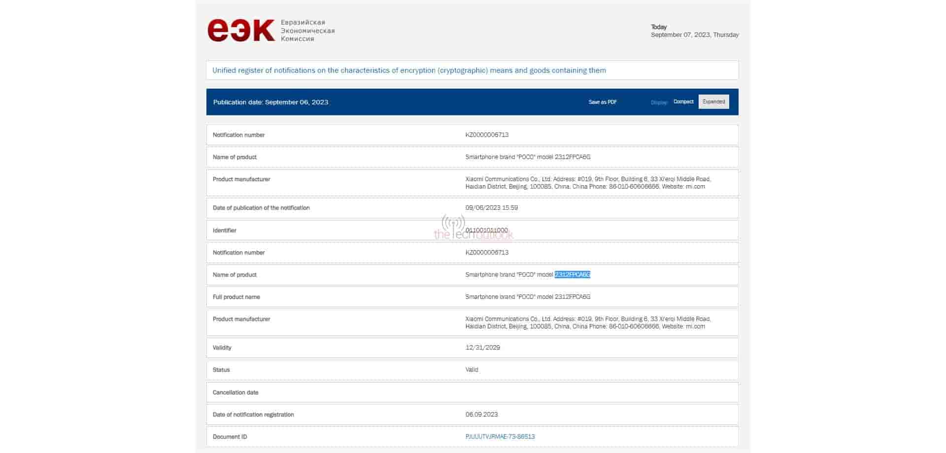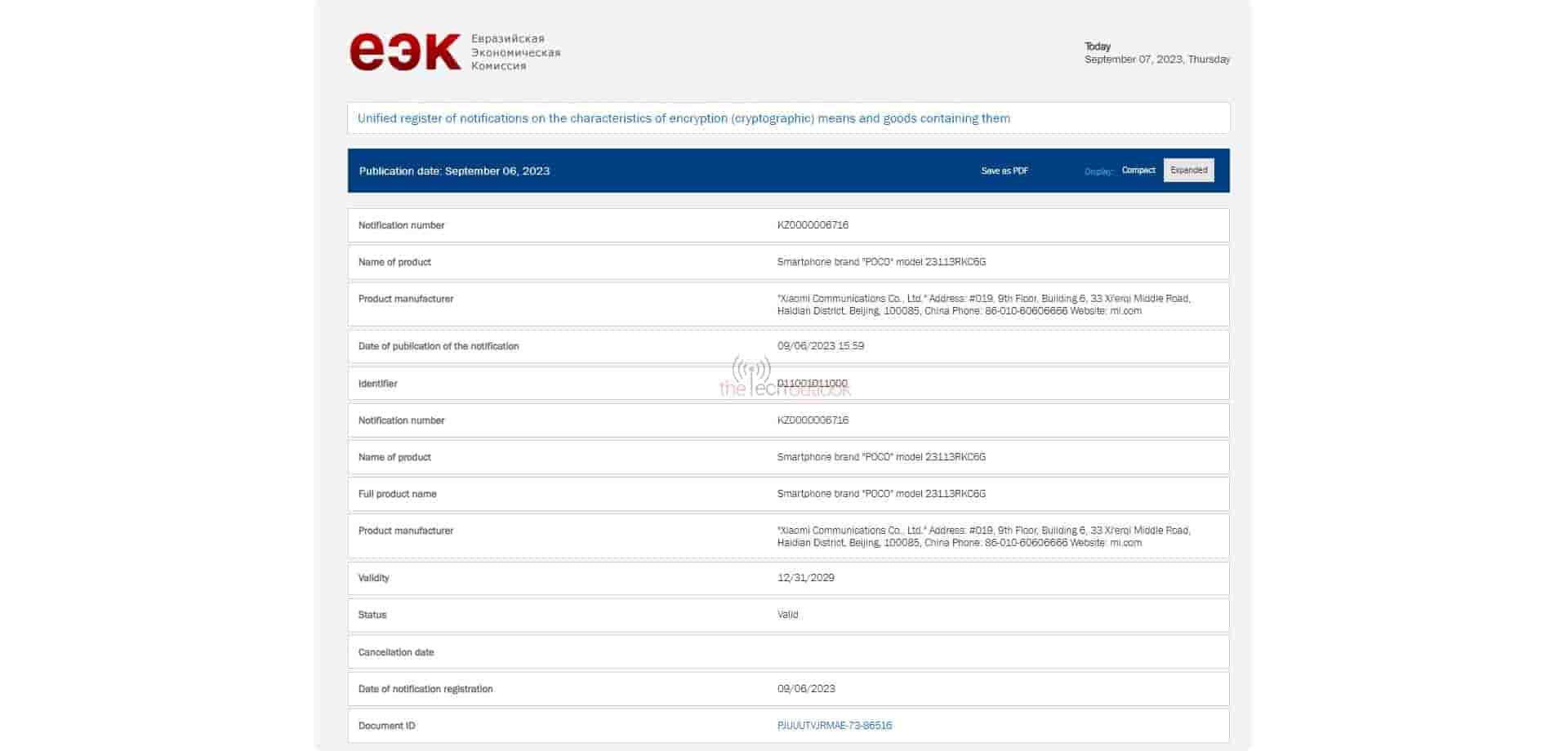 About the POCO smartphones spotted, the two devices have appeared on the certification platform with model numbers – 2312FPCA6G and 23113RKC6G, and the two smartphone devices have received the certification with the notification numbers – KZ0000006713 and KZ0000006716.