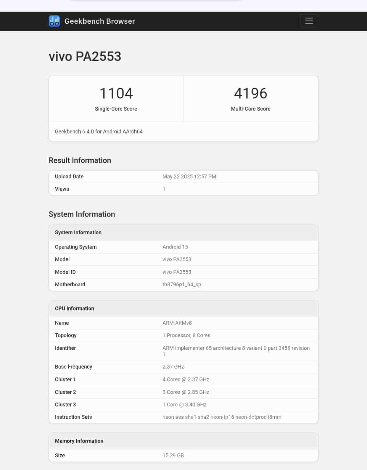 The device was spotted with the model number PA2553. It received a 1104 single-core score and a 4196 multi-core score. It is powered by an octa-core processor that includes 4 cores clocked at 2.37GHz, 3 cores clocked at 2.85GHz and 1 core clocked at 3.40GHz. The database reveals that the device arrives with a Mali-G720-Immortalis MC12 GPU, which suggests that it could arrive with MediaTek Dimensity 9300+ SoC. It runs on Android 15 OS with OriginOS version DPD2437I_A_15.0.13.4.W10 and was spotted with a 16GB RAM option.