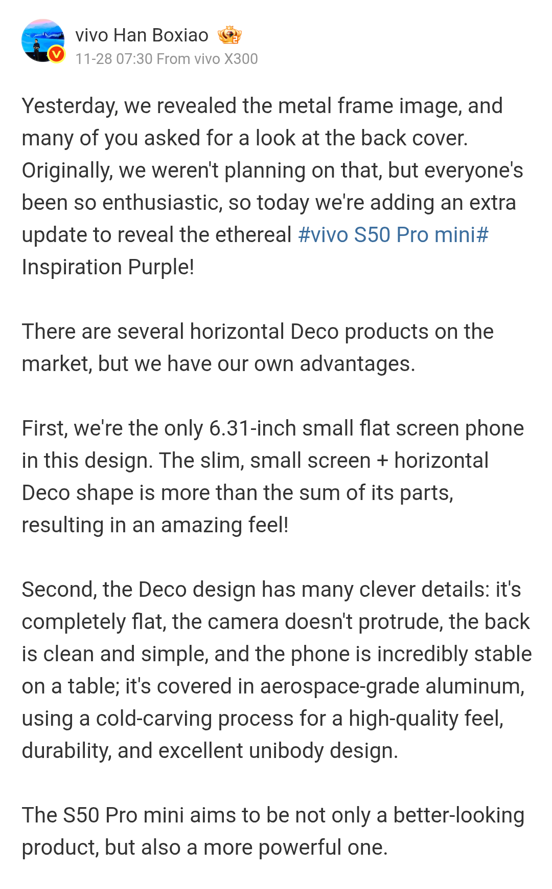 Just recently, Vivo’s Product Manager – Han Boxiao via his Weibo handle had shared the design features of the upcoming S50 series. Now, along with the rear panel design of the S50 Pro mini model, its specs and other key features have also been teased.