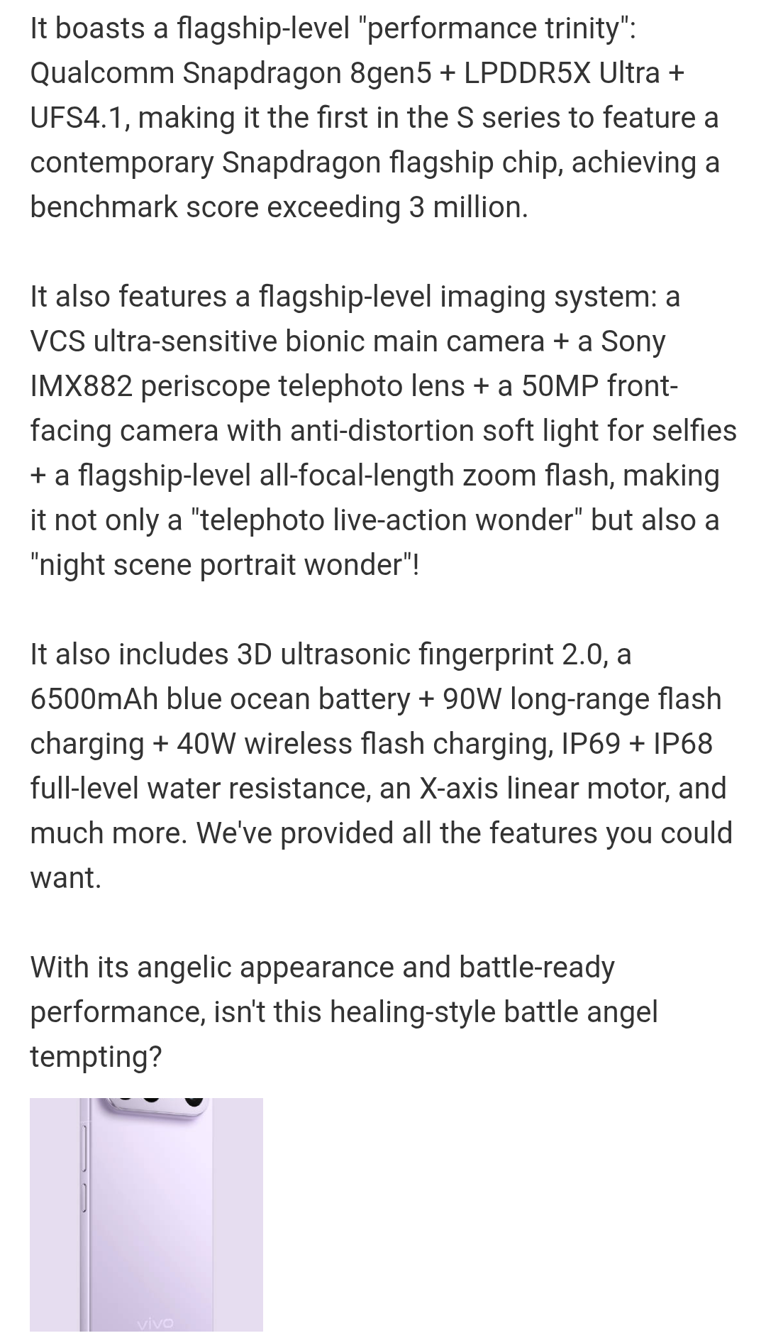 Speaking more, Han Boxiao again reiterates specs such as the Qualcomm Snapdragon 8 Gen 5 chip, LPDDR5X Ultra RAM, UFS 4.1 storage, and 3 million+ AnTuTu score for Vivo’s S50 Pro mini model. On the camera side, a VCS ultra-sensitive bionic main camera, Sony IMX882 periscope telephoto camera, 50MP front-facing camera, anti-distortion soft light for selfies, and a flagship-level all-focal-length zoom flash are being offered on the device.