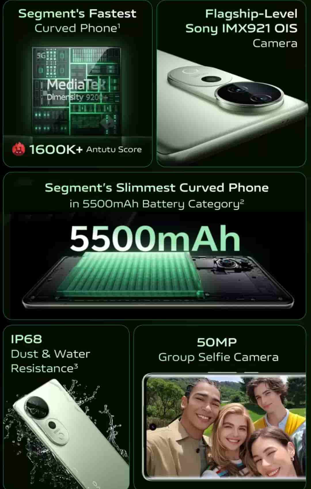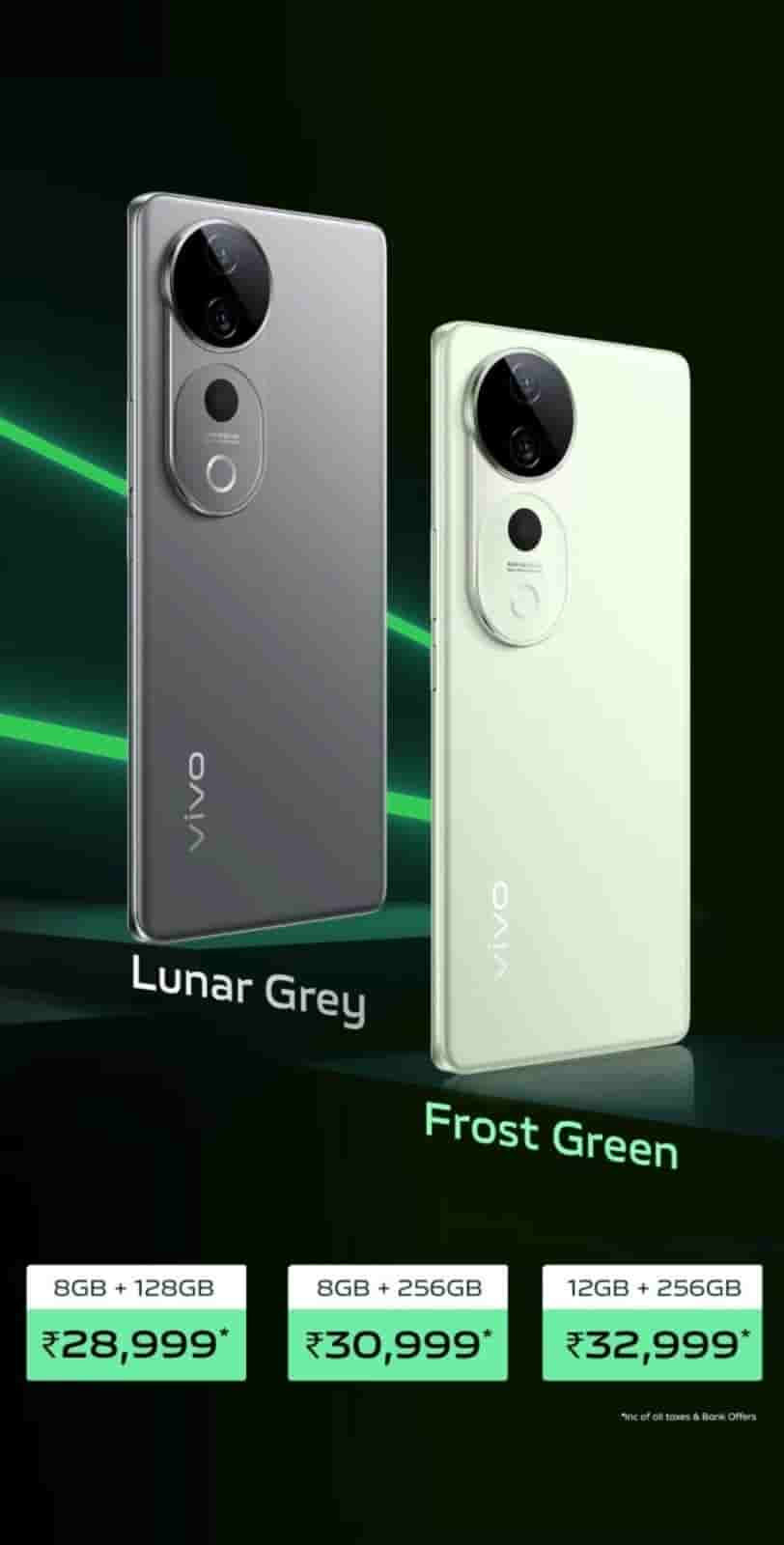 It is backed by 5500 mAh battery that supports 80W fast charging. It runs on Funtouch OS 14. It weighs 192g and is 0.758cm thin. Other features include- 4k video recording at 60fps, AI Photo Enhance, AI Erase, IP68 dust and water resistance, 12GB Extended RAM, 4023 mm2 VC Coolin system, dual SIM, Bluetooth 5.3, in-display optical fingerprint sensor.
