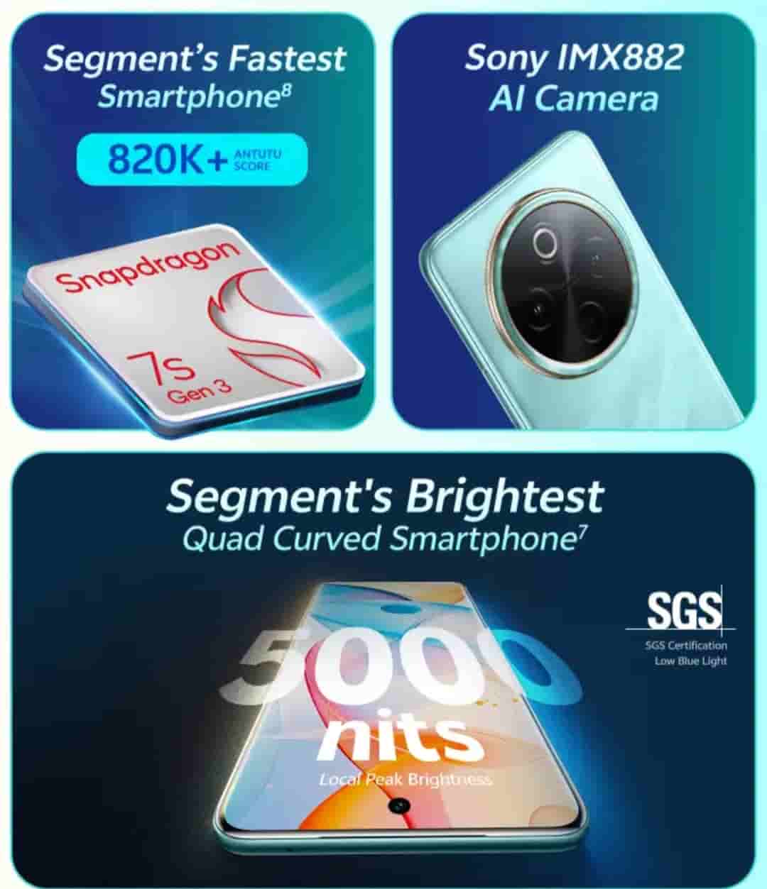 The device sports a 6.77-inch AMOLED quad curved display that offers a 120Hz refresh rate, AI Eye Protection, and 5000 nits local peak brightness. The display arrives with SGS Low blue light certification, drop-resistant protective film, and Schott shield glass. It is powered by the Snapdragon 7s Gen 3 SoC and runs on Funtouch OS 15. It is said to receive 2 OS upgrades and 3 years of security updates. The device packs a 50MP Sony IMX882 OIS main camera, 2MP bokeh camera, and IR blaster on the rear side, while on the front it features 3a 2MP selfie camera.