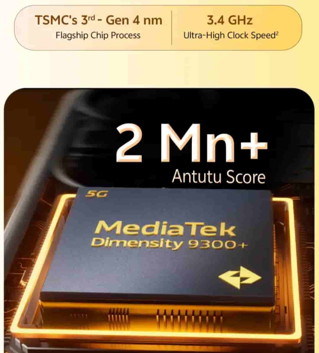 The device will arrive with the segment’s first 10x telephoto macro zoom. With a 10x telephoto, you can capture stunning stage portraits with flagship periscope zoom, enhancing facial details. It will be powered by a MediaTek Dimensity 9300+ SoC built on TSMC’s 3rd gen 4nm flagship chip process and arrives with a 3.4GHz ultra-high clock speed. The device comes with a 2Mn+ AnTuTu score. The device is teased to arrive with power that never pauses, while users can zoom into meaningful details with amazing camera capabilities. It will come with AI features as well.