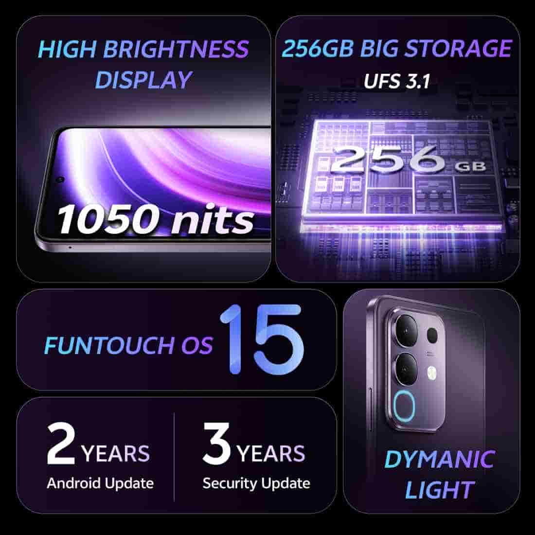 The smartphone sports 6.72 inch FHD+ display that offers a 120Hz refresh rate and 1050 nits brightness. It is powered by MediaTek Dimensity 7300 and has achieved a 728,000+ AnTuTu score. The chipset is built on the latest 4nm process technology and is paired with LPDDR4x RAM and UFS 3.1 storage. It runs on Funtouch OS 15 and offers features like Circle to Search, AI Screen translation, AI Erase, and more.