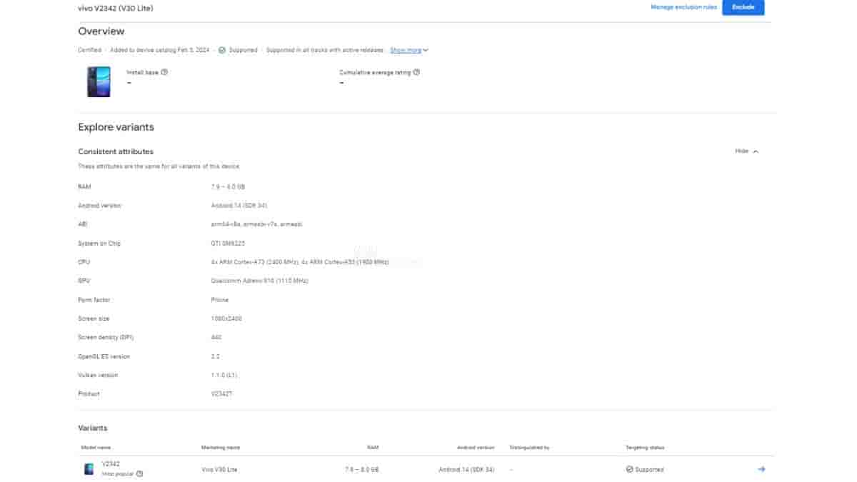 Before I start with the specs that we discovered on the Google Play Console listing. Let me first share that, we also found this smartphone in the Google Play Console supported Devices list with the Model number V2342. After checking, this model number shows two monikers, one is Vivo Y100 4G and the other one is Vivo V30 Lite(This aligns with our previous report). So it won’t be wrong to say that both devices will carry similar specs but will be launched with different names in different markets.