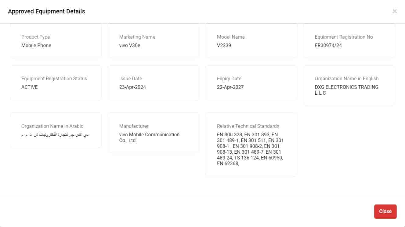 Update 23rd April 2024 – Again we have spotted this smartphone on the UAE’s TDRA certification. It is listed there with a model number “V2339” and an equipment registration number “ER30974/24”. Vivo has already confirmed the Indian launch date of this smartphone and looks like it will be launched in other regions also. The TDRA listing doesn’t reveal much about the hardware or software aspect of this smartphone. But rather put a stamp that it will be launched in UAE also.