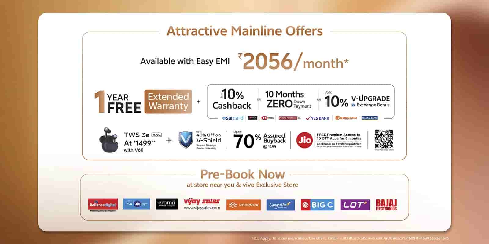 Offline offers feature a free one-year extended warranty, EMI starting at ₹2,056/month, up to 10% cashback, 10 months zero down payment, or up to a 10% V-Upgrade exchange bonus on select bank cards, including SBI, DBS, HSBC, IDFC First Bank, Yes Bank, BOBcard, and Federal Bank. Additional benefits include the vivo TWS 3e (ANC) for ₹1,499, up to 40% off on V-Shield screen damage protection, up to 70% assured buyback at ₹499, and free premium access to 10 OTT apps for six months with the ₹1,199 Jio prepaid plan.