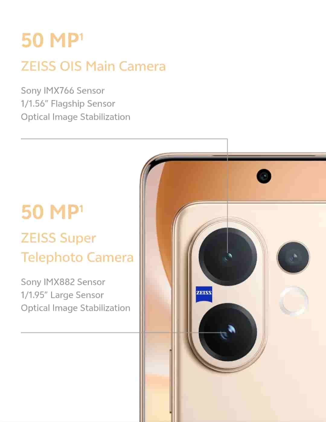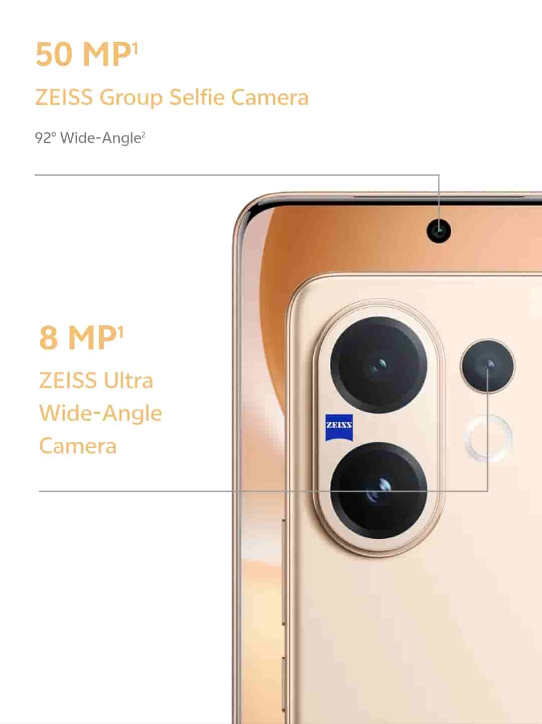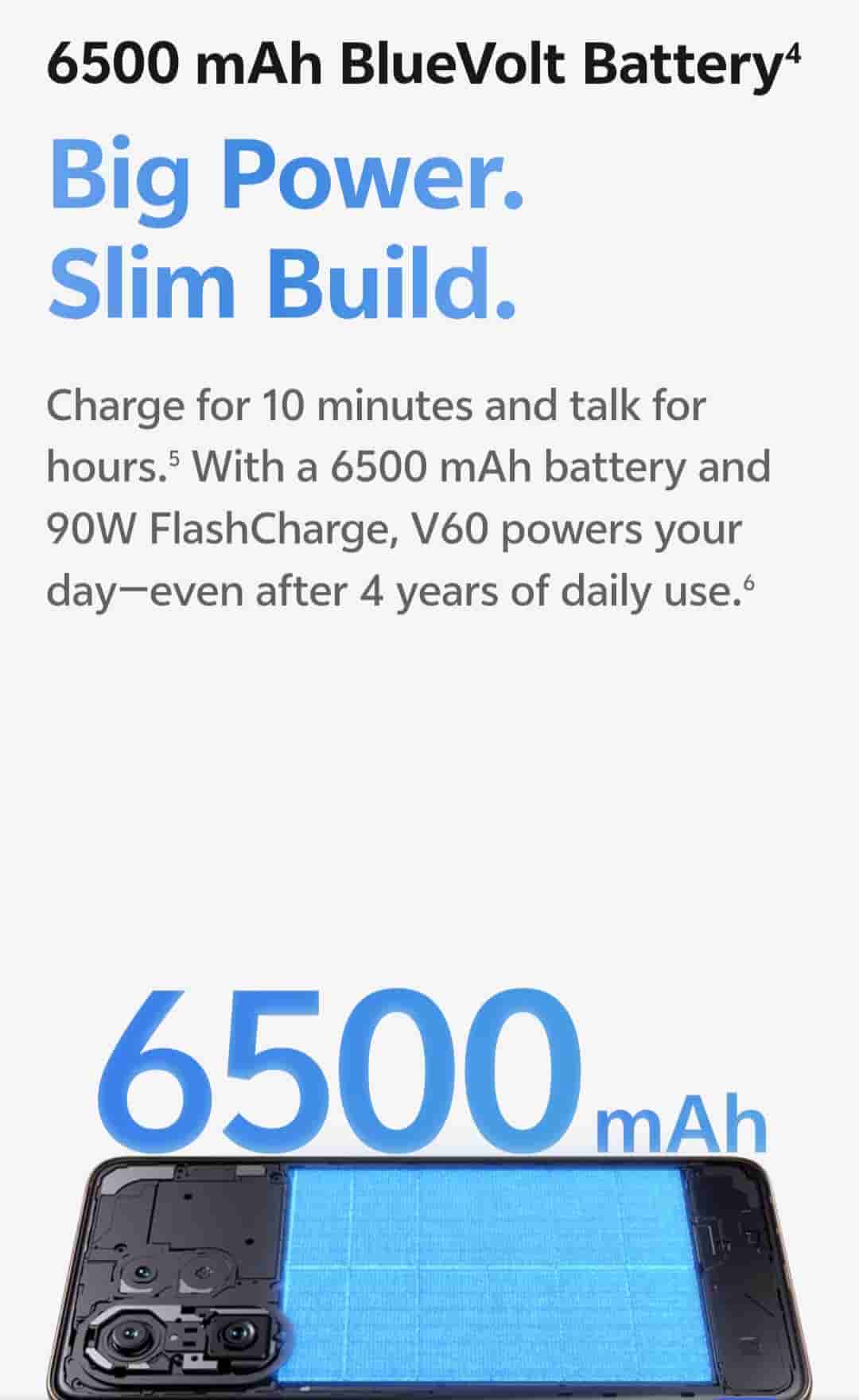 On the rear side, it features a 50MP Zeiss Sony IMX766 main camera (1/1.56″ sensor, OIS), a 50MP Zeiss Sony IMX882 telephoto camera (1/1.95″ sensor, OIS, 10x zoom), and an 8MP Zeiss ultra-wide-angle camera. On the front, it features a 50MP Zeiss group selfie camera (92-degree wide angle). Camera features include Zeiss Multifocal Portrait and AI Four-Season Portrait. The device is backed by a 6500mAh BlueVolt battery and supports 90W FlashCharge. Vivo V60 powers your day even after 4 years of daily use.