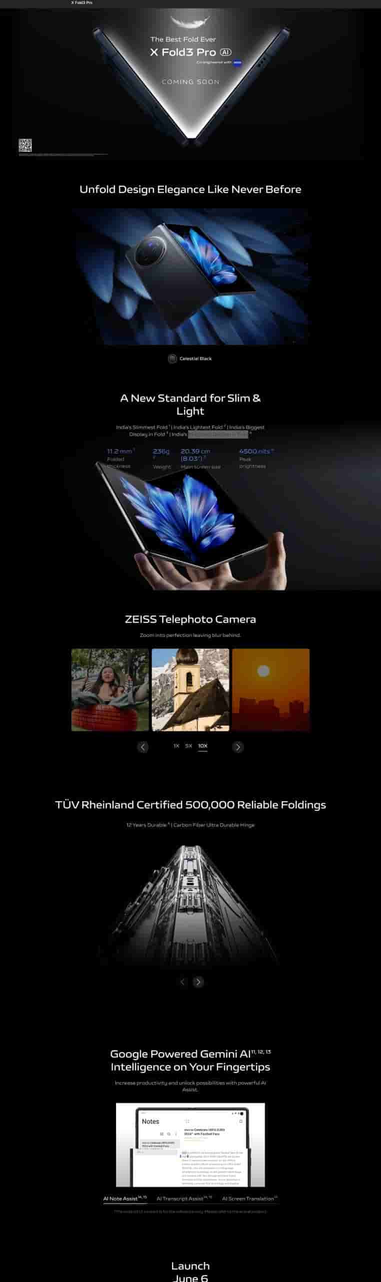 Update 20th May 2024 – Vivo India’s official website has unveiled the launch date for their upcoming smartphone, slated for June 6th, 2024. The microsite also provides a sneak peek into some key specifications, including details such as its weight, the presence of a Zeiss telephoto camera, and its TUV Rheinhald 5,00,000 folding certification.