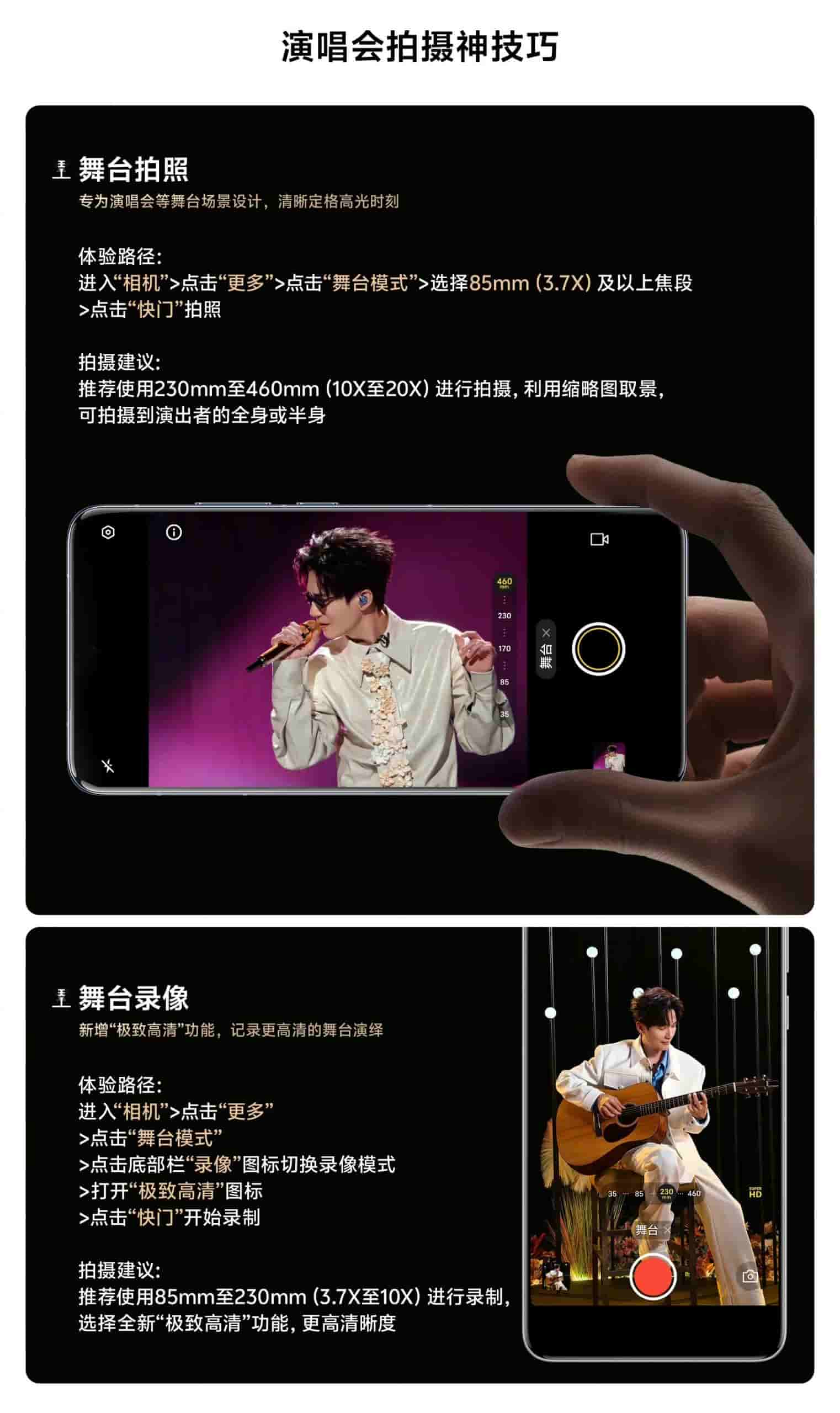 To record higher definition stage performances, with the help of the new Ultimate HD function on Stage Mode, after switching the video/recording mode, open Ultimate HD functionality and tap on shutter to start recording. Using 85mm to 230mm (3.7X to 10X) is recommended.