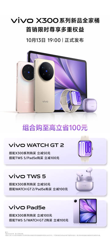 If you purchase the Vivo Watch GT 2 with the Vivo X300 series, you can get 50 Yuan off, while with Pad 5e/TWS 5, you can get 100 Yuan off. If you purchase the Vivo TWS 5 with the Vivo X300 series, you can get 50 Yuan off, while with the Watch GT 2/Pad 5e, you can get 100 Yuan off. If you purchase the Vivo Pad 5e with the Vivo X300 series/ TWS 5/ Watch GT 2, you can get 100 Yuan off.