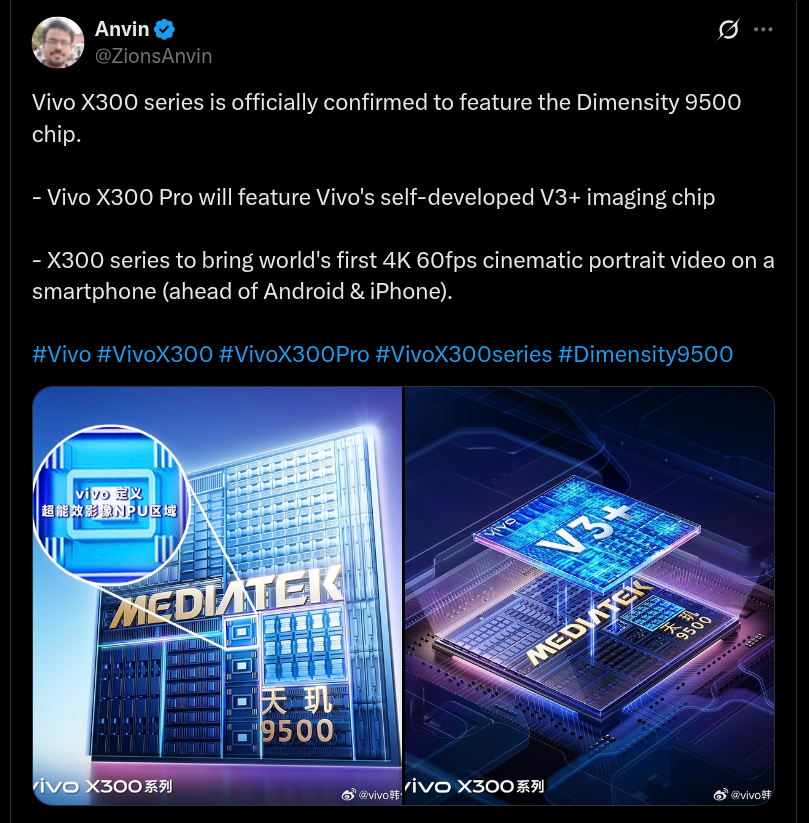 Vivo X300 Series Confirmed to Use Dimensity 9500 Chip and Support 4K 60fps Cinematic Portrait Video; Vivo X300 Pro to Equip V3+ Imaging Chip