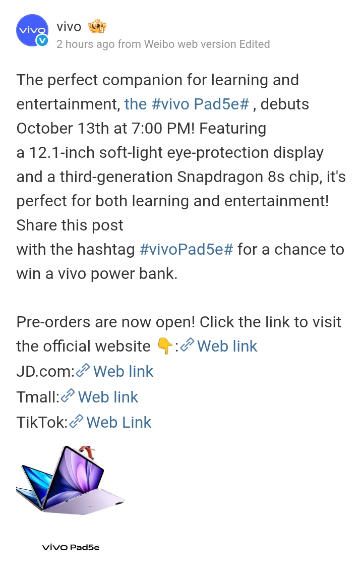 Coming to the Vivo Pad 5e, it has been teased as a perfect companion for learning and entertainment, and it features a 12.1″ soft-light eye-protective display. Qualcomm’s Snapdragon 8s Gen 3 chipset, PC-level WPS, and customized CAJViewer are its other notable key specs. Also, the teaser poster suggests three color variants for the device and customers will be able to get it in Black, Blue, and Purple colors. [To note: the pre-order for the Vivo Pad 5e is now open in China.]
