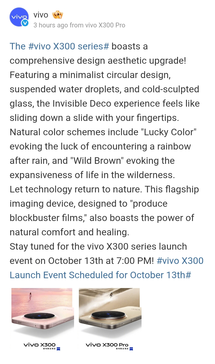 As per the newly-shared teaser updates, Vivo’s X300 series smartphones will be featuring a comprehensive design aesthetic upgrade this time over its predecessors, and notably this include design aspects such as a minimalist circular design, suspended water droplets, cold-sculpted glass, and an invisible camera module experience. Natural colors like ‘Lucky Color’ and ‘Wild Brown’ have been teased respectively for the standard Vivo X300 and the Vivo X300 Pro smartphone models, and the two are pointed out to be flagship imaging devices that are capable of producing ‘blockbuster films’.