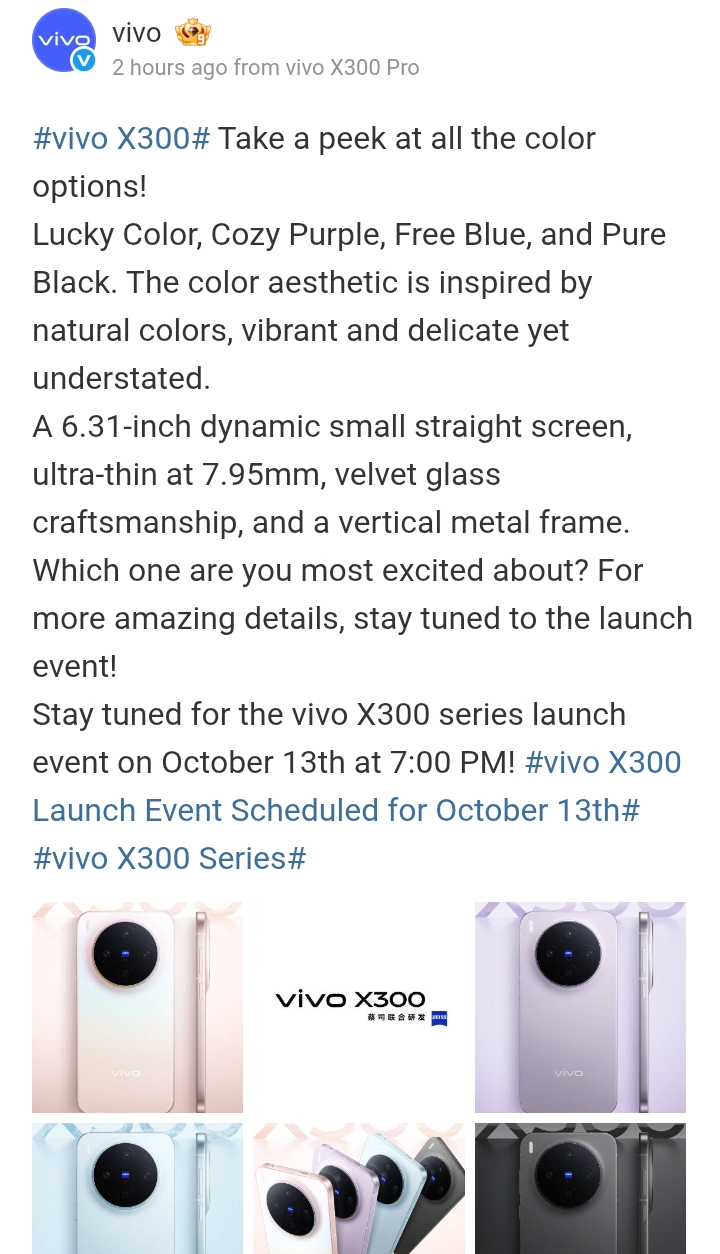For the Vivo X300 smartphone, the brand has also teased other specs as well, and it is revealed to feature a 6.31″ dynamic small straight screen, a 7.95mm ultra-thin body, velvet glass, and vertical metal frame. Four color variants can also be expected for this device including the Lucky Color, and the three other color choices are Cozy Purple, Free Blue, and Pure Black.