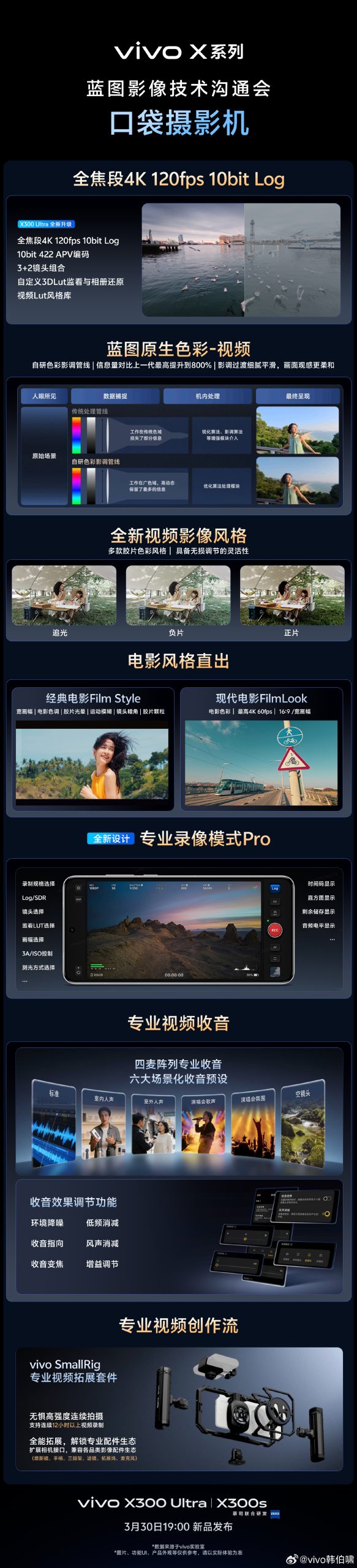 This smartphone boasts features like- Professional Video Mode Pro, Film cinematic style, SmoothEV algorithm, personalised camera styles, Blueprint color palette, full-range 4K 120fps 10-bit Log, multiple film color styles, four microphone array professional sound recording with six scenario-based sound presets and audio effect adjustment function. The device comes with the Vivo SmallRig Professional Video expansion kit.