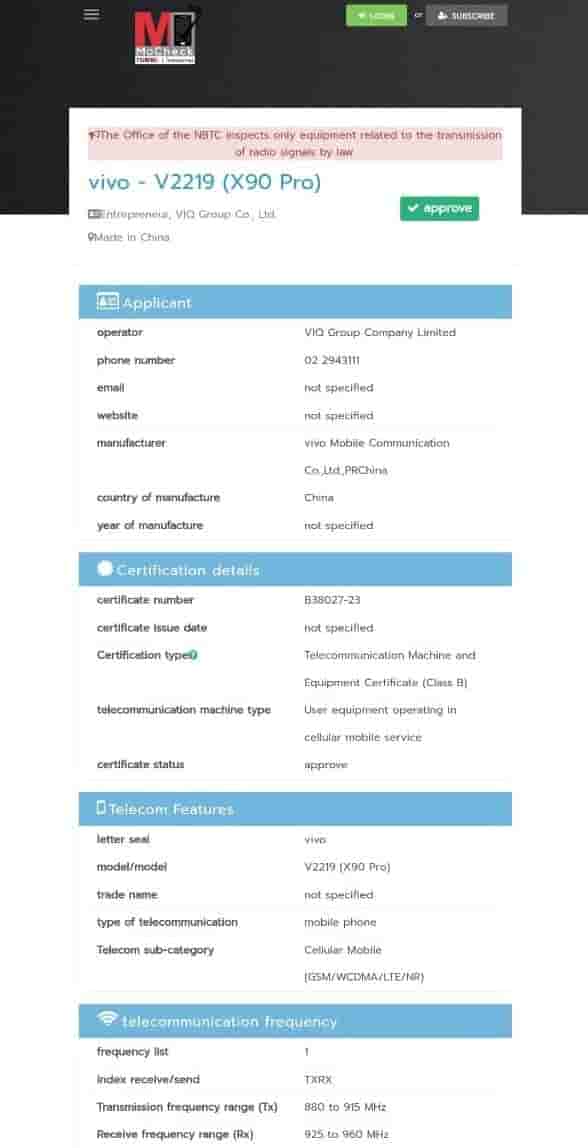 Now even before it’s launch, Vivo X90 Pro V22119 has appeared on NBTC, TKDN &EEC certification databases. The NBTC certificate can be checked by its certificate number B38027-23 whereas the TKDN certificate can be checked by its certificate number 5976/SJ-IND.8/TKDN/11/2022. These databases have now provided with little information regarding the Vivo X series smartphone.