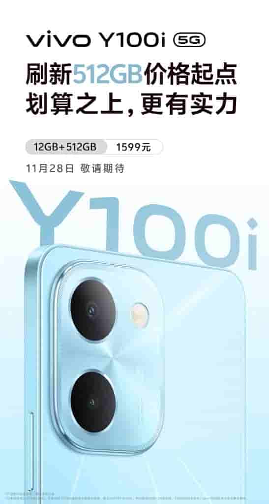The Vivo Y100i is all set to launch on Nov. 28 in China. The company confirmed that the 12 GB RAM + 512 GB storage edition of the device will be priced at 1,599 Yuan (~$220). As the posters reveal, the Y100i will be available in at least two colours, such as blue and pink.