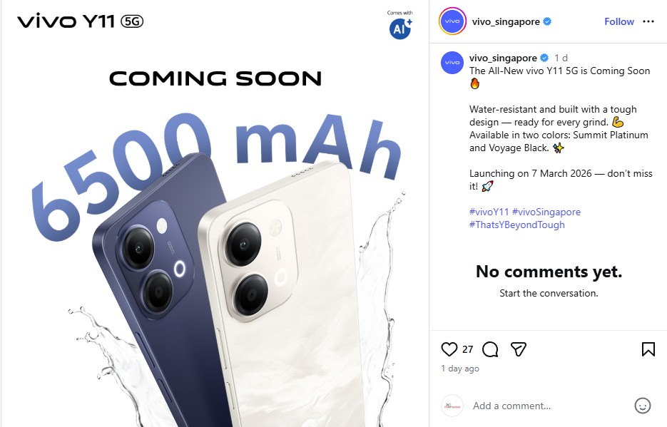 In the post shared by Vivo Singapore on its official Instagram handle, the launch date has been confirmed for March 7th, 2026. Besides confirming the launch date, the poster reveals that it will pack a 6500mAh battery (15W fast charging revealed via TUV) and will come in Summit Platinum (glossy marble finish)/Voyage Black (matte finish) colour options. The marketing text also confirms that the phone is going to be water resistant and is “built with a tough design”.