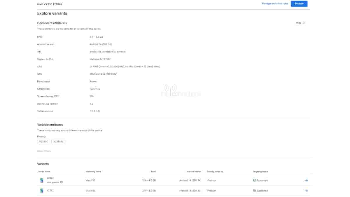 The Tech Outlook has spotted the Vivo Y18e smartphone on the Google Play Console database with model number V2333.