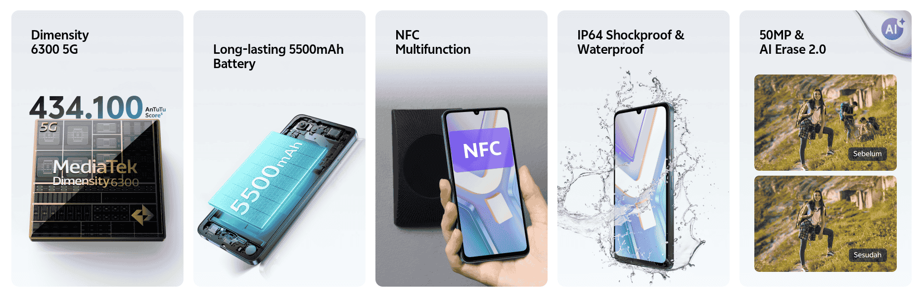 Other key specs include 5G/4G/3G/2G network connectivity, dual-band WiFi (2.4G + 5G), Bluetooth 5.4, USB 2.0 (Type-C), NFC, GPS, OTG, side-mounted fingerprint scanner, Crystalline Matte back, and IP64-rated dust and splash resistant body. Two color variants are also available for the device, and Indonesian customers can get it in Green Jade and Purple Crystal colors.