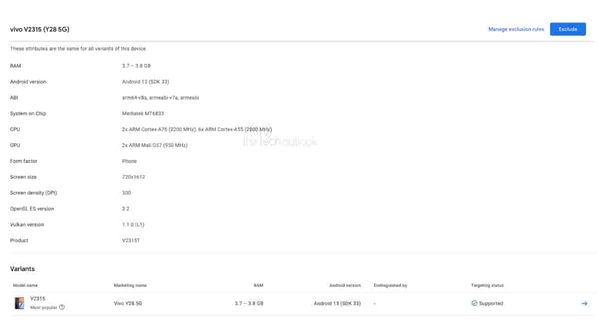 Today our team at The Tech Outlook has spotted the upcoming Vivo Y28 5G on the Google Play Console website with model number V2315.
