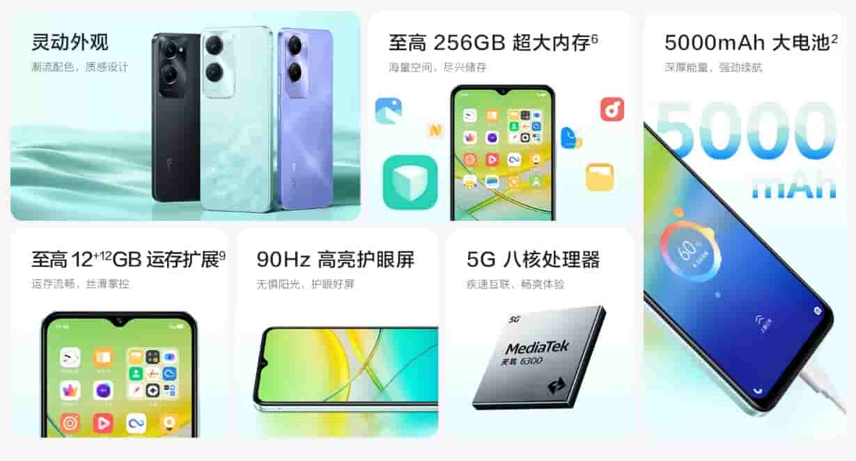 Under the hood, it is powered by the Dimensity 6300 SoC (2.4GHz × 2 + 2.0GHz × 6), paired with up to 12GB + 12GB (Virtual RAM) of LPDDR4X dual-channel RAM and up to 256GB of eMMC 5.1 internal storage. The device runs on OriginOS 14, based on Android 14.