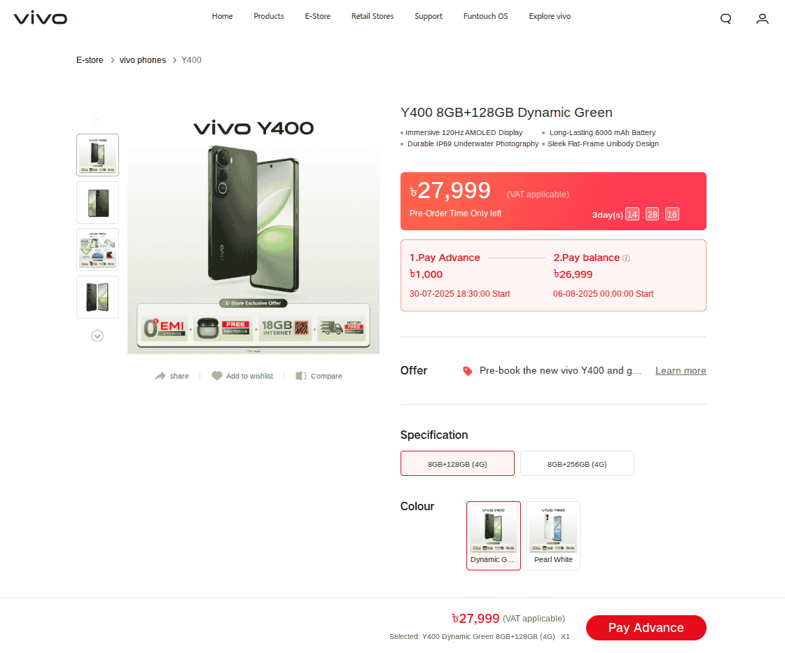 As mentioned, two storage models have been introduced in Bangladesh for the Vivo Y400 4G smartphone, and customers can get it in 8GB/128GB and 8GB/256GB storage options that are priced at BDT 27,999 and BDT 29,999 respectively. Also, it comes in two color choices of Dynamic Green and Pearl White.