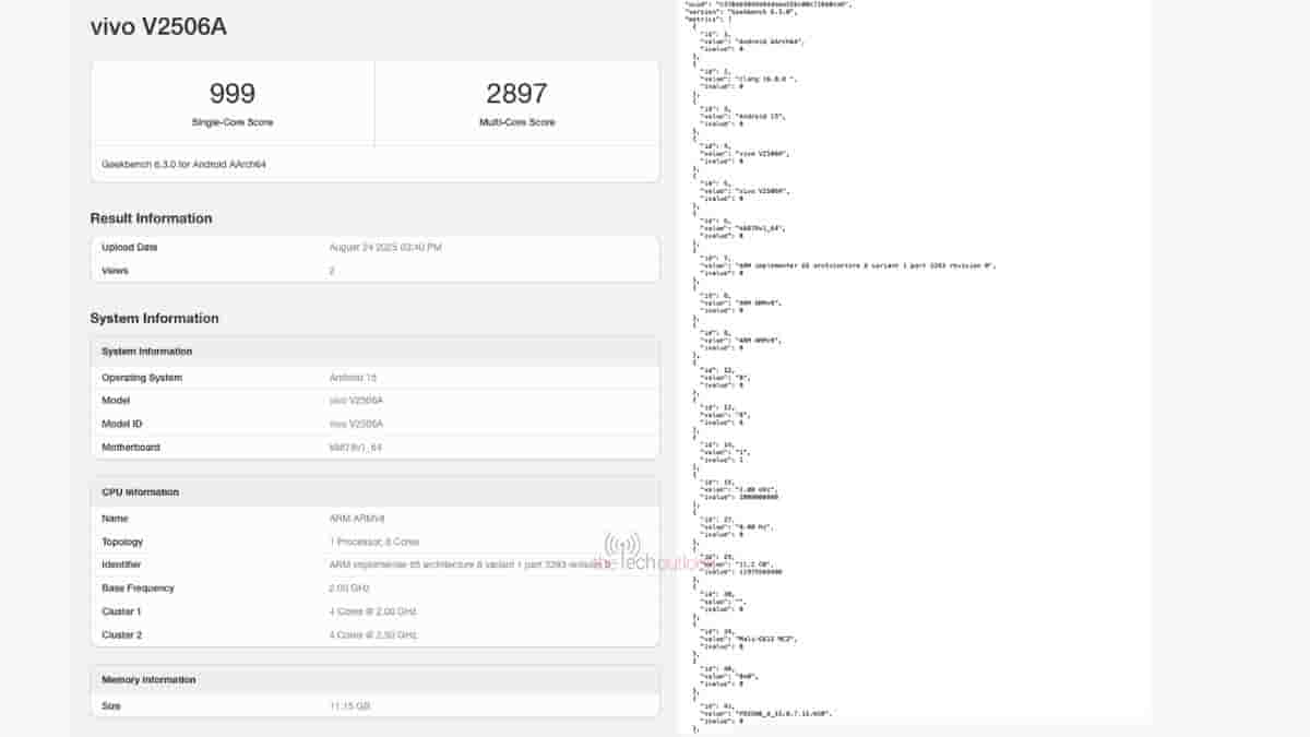 Apart from the confirmed specs, the Vivo Y500 has also been spotted on the Geekbench database with the model number ‘V2506A’ (model number confirmed via JD.com). The listing shows a single-core score of 999 and a multi-core score of 2897. The CPU shows two clusters with 4 cores clocked at 2.0GHz and the other 4 at 2.5GHz. The source code also confirms the Mali-G615 GPU, which suggests the phone is powered by the MediaTek Dimensity 7300 SoC. Along with this, the listing also confirms Android 15 (version PD2506_A_15.0.7.15.W10) and 12GB of RAM.
